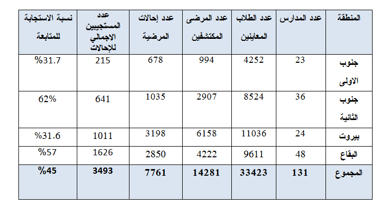 النتائج الإجمالية في المدارس بحسب المناطق للكشف الطبي العام: