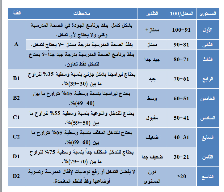 فالمدارس المصنفة تتطلب التدخل في مجال الصحة المدرسية والبرامج التوعوية من ناحية الطلاب والاهل والكادر التعليمي بشكل مكثف بنسبة 50% الى 79%، وهناك مدارس لا تتوفر فيها المواصفات الرسمية، لذلك تُعطى التوصيات اللازمة لتحسين المدرسة على كافة الاصعدة، أو في حال عدم الاستجابة، يتم العمل على إقفالها عبر الجهات الرسمية وتسوية أوضاعها وفقاً للقوانين والنظم المعتمدة .