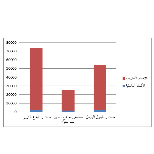 عدد الخدمات في الأقسام الداخلية والخارجية في المستشفيات الثلاث في النصف الأول من العام 2016.