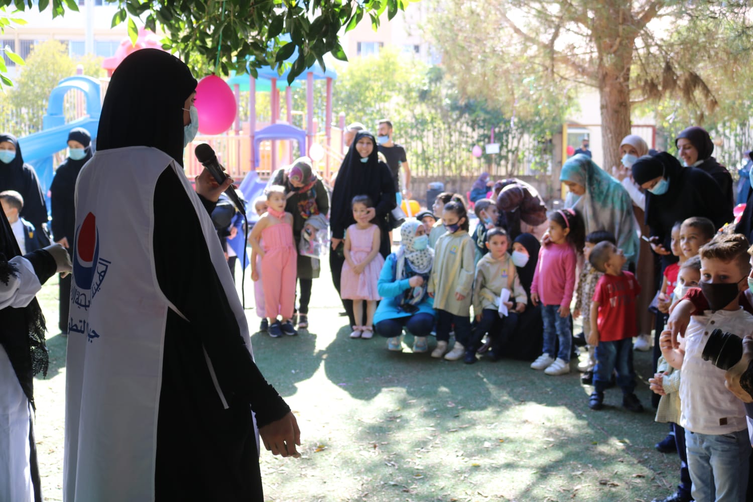 حيث تفاعل الاطفال مع المسرحية وبعد الانتهاء تم توزيع كمامات ملونة على التلامذة المشاركين.